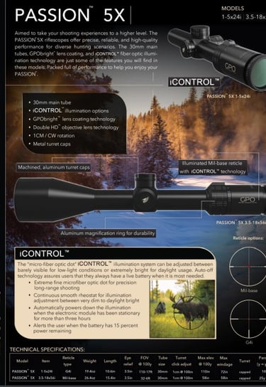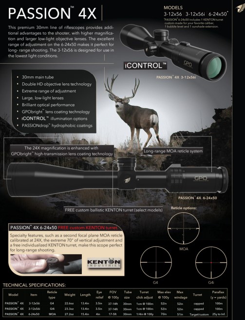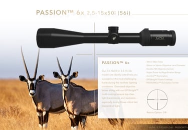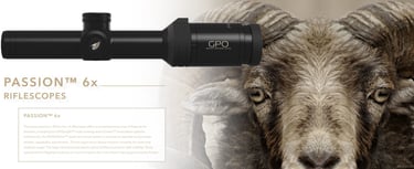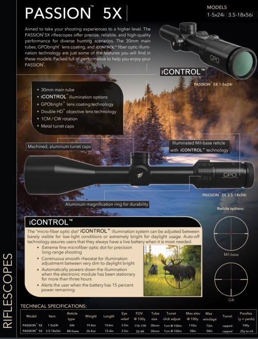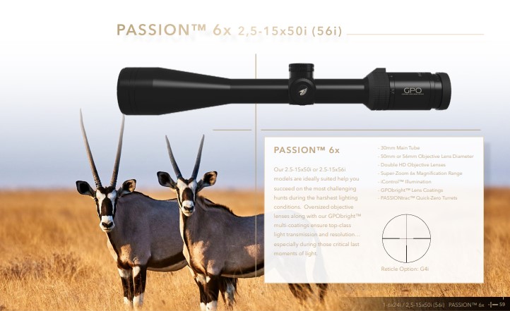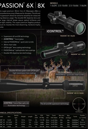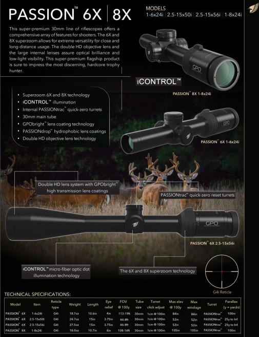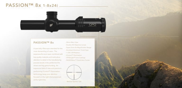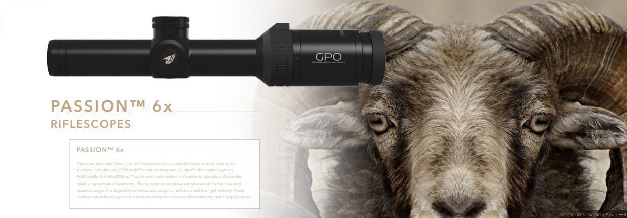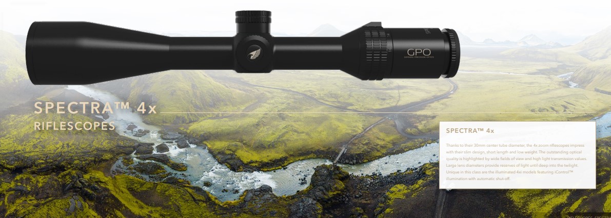 GPO optinių taikiklių modeliai su GPObright technologija: Spectra 5x, Spectra 8x, Passion 5x, Passion 6x, Passion 8x.