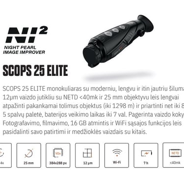 Skaitmeninis priartinimas 2x, 4x. Su PIP funkcija priartinimas iki 8x. Optinis priartinimas 2,5x su Scops 25 Elite ir 3,5x su termovizoriumi Scops 35 Elite.