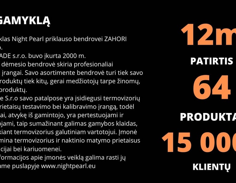 Naujoji programa sukurta Night Pearl prekinio ženklo gamykloje Čekojoje, kur atliekamas šių termovizorių (kaip ir kitų termovizorių, tokių kaip Infiray, Pulsar) garantinis aptarnavimas.